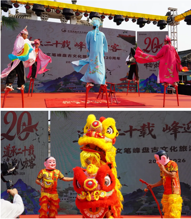 随后,河北表演队带来的《踩高跷》与本地舞龙舞狮表演活力迸发,